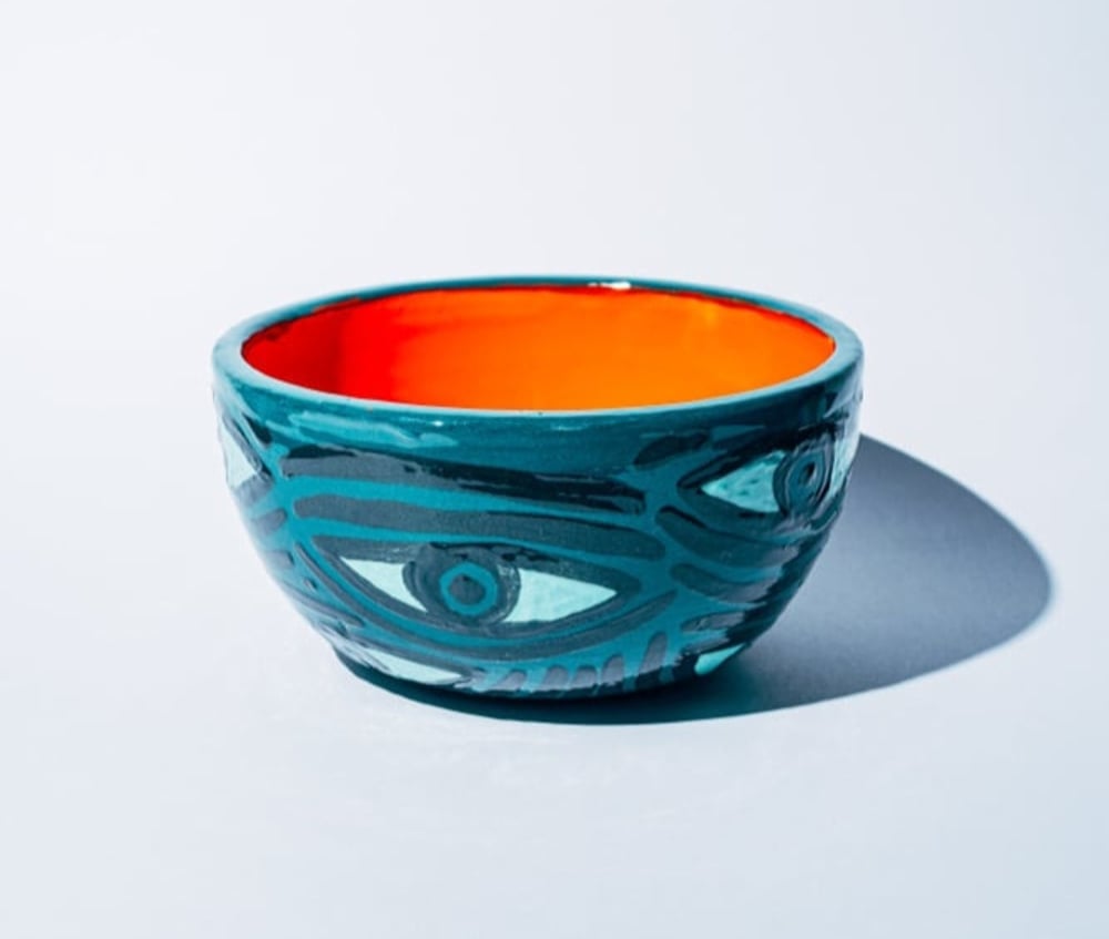 One is tempted, before even holding it in one’s hand, to assign to this object a genealogy that stretches back to the most perilous of legends. The Bowl of Wisdom by SuperBlast is a ceramic vessel, modest in size, yet it carries the gravity of an artifact that alludes to the Grail itself—the chalice into which centuries of Western imagination have poured their longing for transcendence. Yet here, instead of solemn austerity, we encounter a playful, almost ironic iconography: two handful of eyes, unblinking, stare from its petrol-green-blue skin, their whites rendered in mint tones as though purified by some vegetal alchemy.